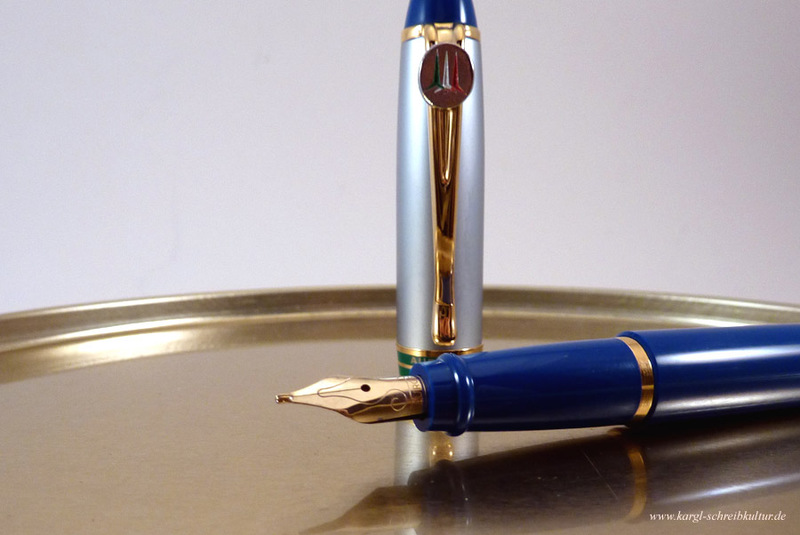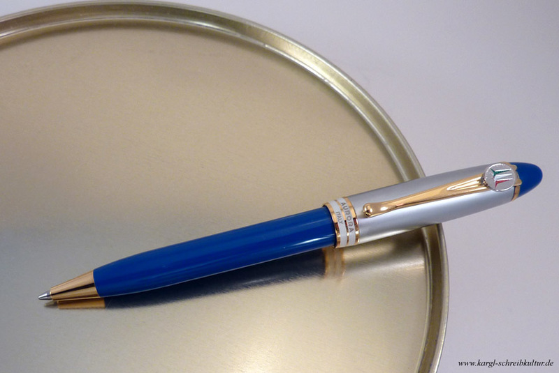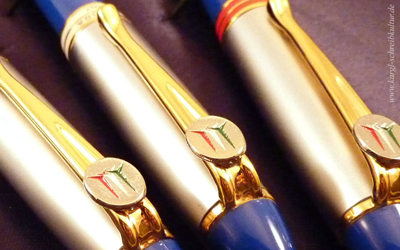Jedes der drei Schreibgeräte präsentiert sich in einem strahlenden Blau - und einer silberfarbenen Kappe, deren Ende jeweils in einer der italienischen Landesfarben gefärbt ist.