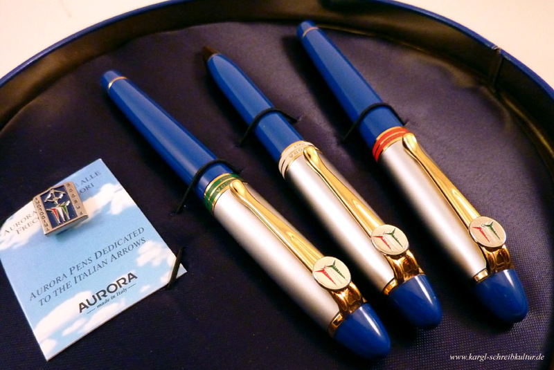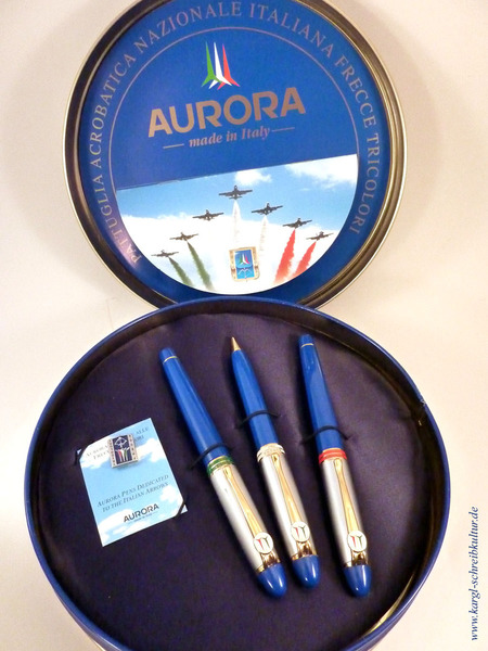 Set bestehend aus Füllfederhalter, Kugelschreiber und Rollerball, das den italienischen Dreifarbenpfeilen, der Kunstflugtruppe "Frecce Tricolori" der italienischen Luftwaffe