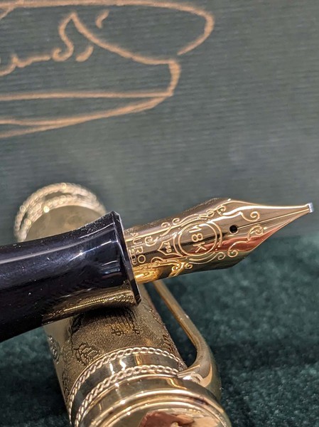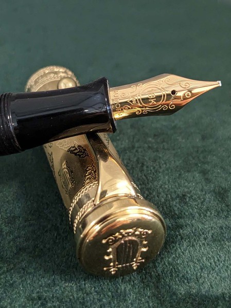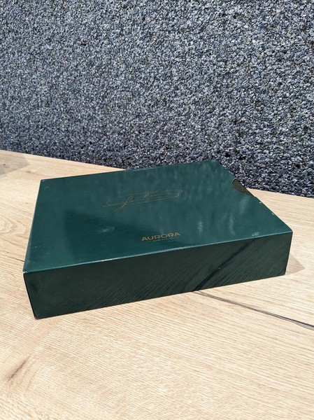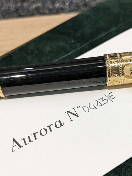 Name der Firma Aurora, eine kurze Notenfolge aus einer von Verdis Opern und die Seriennummer 0586. Die Kappe ist mit Lyra und Blättern verziert. Die Feder besteht aus 18karätigem Massivgold und