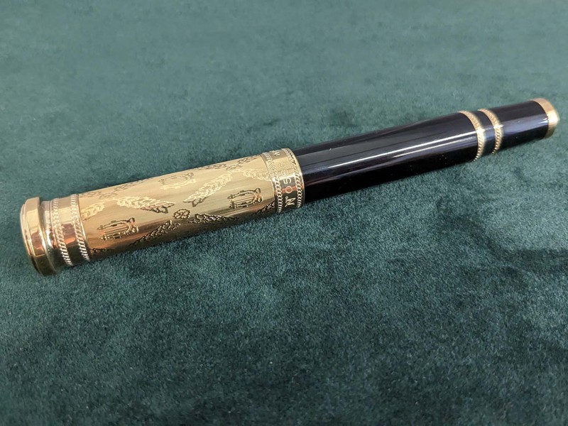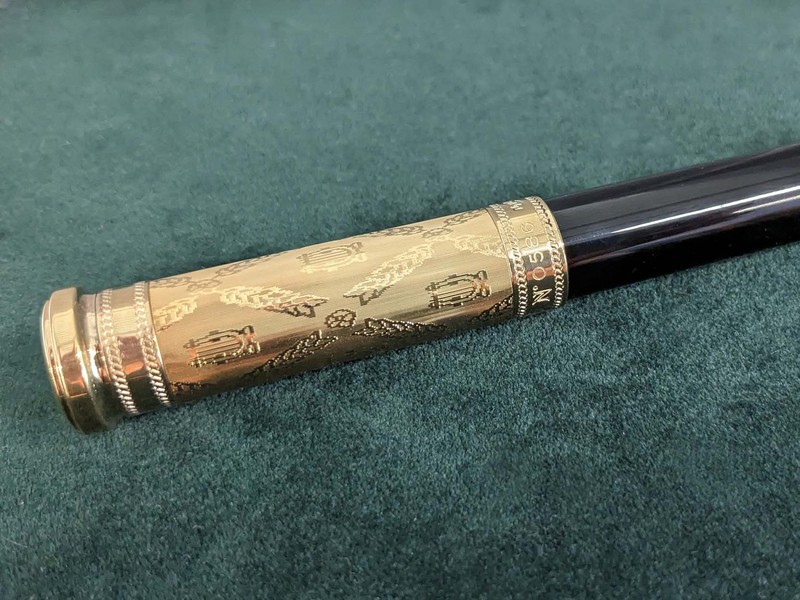 für den Rest der Welt produziert. Der Korpus des Schreibgeräts ist aus schwarzem Edelhart gefertigt. Kappe, Ringe und Schreibkopf sind aus vergoldetem 925er Silber. Auf dem Kappenband findet sich der