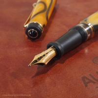 Ein wunderschöner Füllfederhalter mit goldfarbener Feder und gelb-brauner Marmorierung.