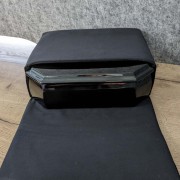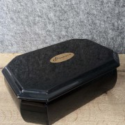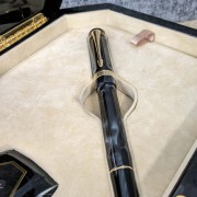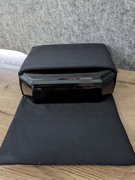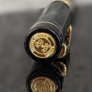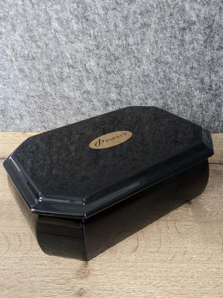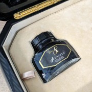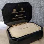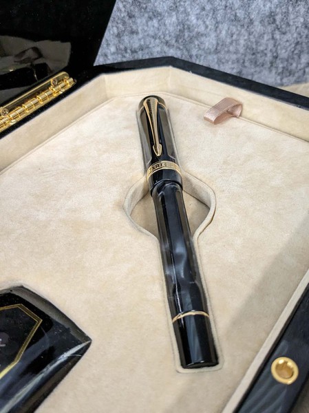 Füllfederhalter und Tintenfaß präsentieren sich in einer luxuriösen, hochglänzenden, schwarz lakierten Holzbox. Diese wiederrum befindet sich in einer hochwertige Stoffhülle aus wattiertem