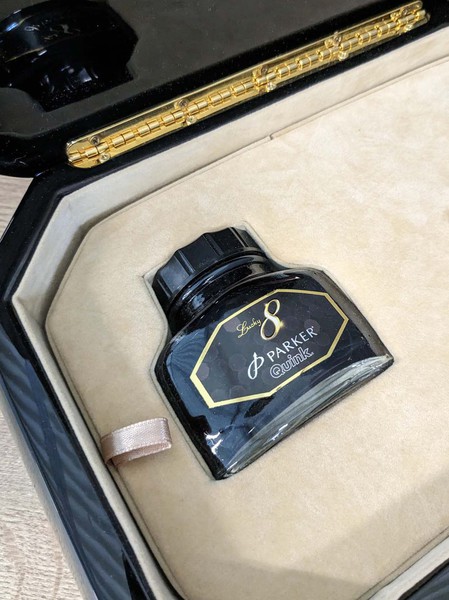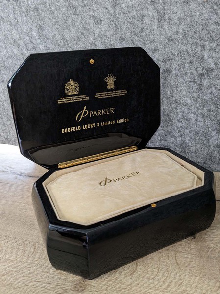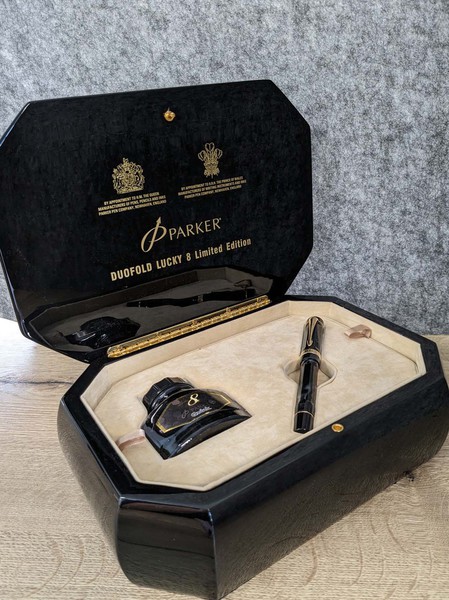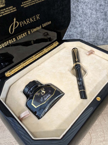 Das Parker Duofold Lucky 8-Set wurde anlässlich des 120jährigen Parker-Jubiläums im Jahr 2008 herausgegeben. Der Korpus des Füllers besteht aus feinem Acrylharz mit leichten grauen,