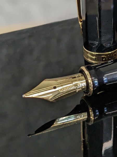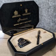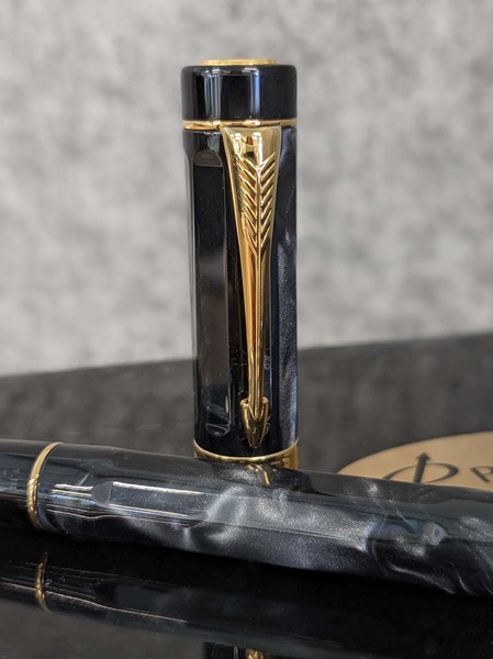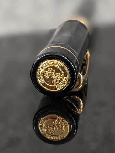 2008". Der Clip im Pfeildesign und das Band auf der Kappe sind vergoldet. Die M-Feder ist aus 18karätigem Gold gefertigt - und mit Pfeil und Parker-Logo aus den 1920er Jahren